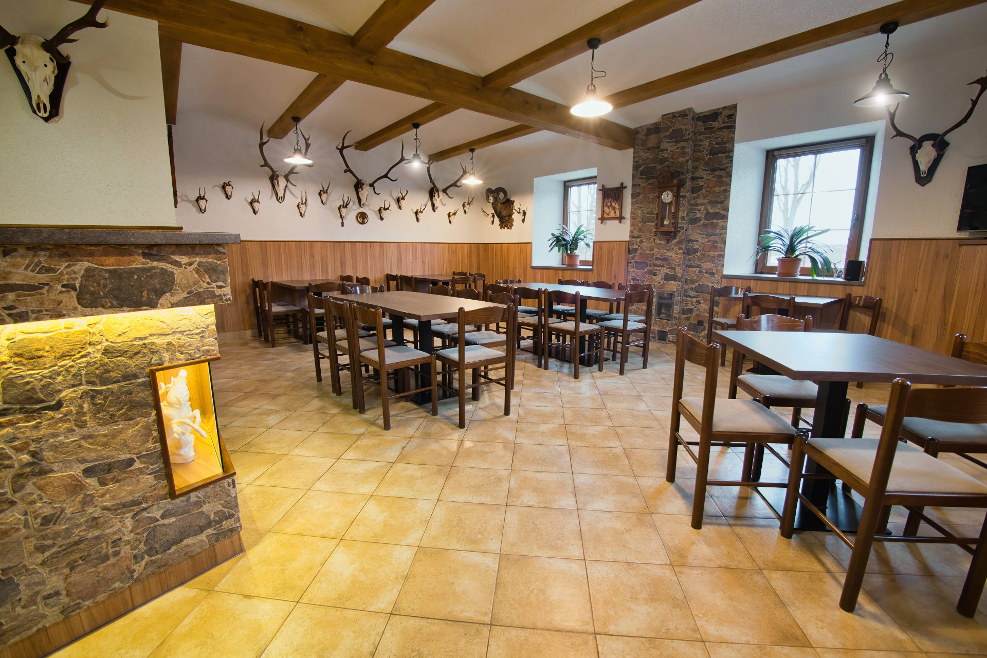 Velká společenská místnost s barem a výčepním zařízením 65m2/32 míst k sezení, TV, stolní fotbálek, oddělené WC, venkovní terasa s grilem.