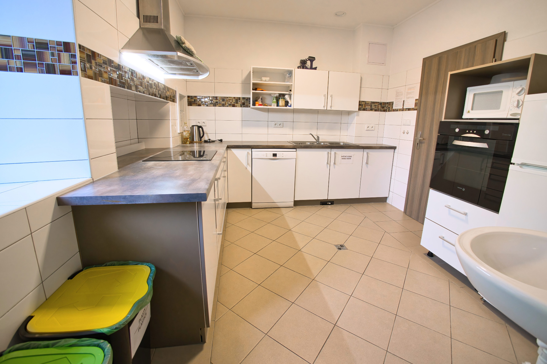 Kapacita 12 osob. Součástí je kuchyňka s dřezem, mikrovlnou troubou, sklokeramickou deskou a vestavěnou lednicí.